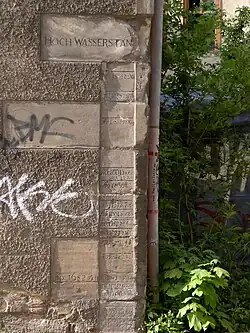 An der Südostecke der Außenmauer sind Hochwassermarken eingehauen, die älteste aus dem Jahr 1585, die jüngste Flutmarke aus dem Jahr 1854. Mindestens 29 Hochwasser sind an der Mühle, auch an Pfeilern im Inneren, verzeichnet.