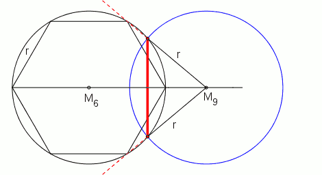 Der Winkel ist nahezu gleich einem Drittel des Winkels . Somit ist auch der Winkel nahezu gleich dem gesuchten Zentriwinkel und die Länge nahezu gleich der gesuchten Seitenlänge des Neunecks.