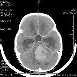 Die Computertomographie des Gehirns zeigt typischerweise eine Gewebsmasse, die entweder durch Kontrast verstärkt werden kann. Bei der CT erscheinen niedriggradige Gliome normalerweise isodens zum normalen Parenchym und zeigen daher möglicherweise keine Kontrastverstärkung. In ähnlicher Weise sind Läsionen in der Fossa cranii posterior, der hinteren Schädelgrube, im CT schwer zu identifizieren. Folglich sind die Ergebnisse einer solchen Tomographie allein nicht immer für diagnostische Zwecke ausreichend.[4] In zweifelhaften Fällen ist die Verwendung der empfindlicheren Kernspintomographie unerlässlich.