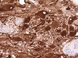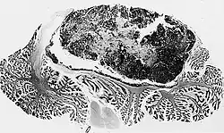 Das Ependymom ist eine Neoplasie, die sich aus Ependymzellen entwickelt, die die Hirnventrikel, den Plexus choroideus, das Filum terminale und den zentralen Kanal des Rückenmarks auskleiden. Ependymzellen sind auch im Gehirnparenchym infolge der embryonalen Migration von periventrikulären Bereichen zur Großhirnrinde vorhanden.[31][32]