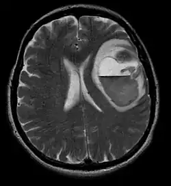 Auf -Kernspintomogrammen erscheint ein intrakranieller Tumor als massive Läsion, die nach Verwendung des Kontrastmittels lumineszierender werden kann. Eine Signalanomalie gibt es jedoch immer in -Kernspintomogrammen, die auf das Vorhandensein einer Neoplasie oder eines vasogenen Ödems hinweist. Normalerweise ist eine stärkere Lumineszenz (Kontrastverstärkung) ein Hinweis auf einen Tumor höheren Malignitätsgrades. Ein Kontrastring ist charakteristisch für ein Glioblastom, wobei der Lumineszenzanteil dem lebenswichtigen Teil des bösartigen Tumors und der dunklere -hypointense Bereich der Gewebenekrose entspricht.[4]