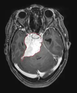 Patienten mit Meningeom können Symptome aufweisen, die für eine massive Schädelläsion typisch sind, einschließlich Anfällen und fokalen neurologischen Defiziten.[35][36] Da Meningeom auch asymptomatisch sein können, werden sie manchmal bei Computer- und Kernspintomographien aus anderen Gründen entdeckt. Dieser Resonanztumor hat ein charakteristisches Erscheinungsbild, das normalerweise aus einer gleichmäßigen Kontrastverstärkung entlang der Dura mit klarer Trennung vom Gehirnparenchym besteht. Ein weiteres Merkmal, obwohl nicht in allen Fällen vorhanden, ist der sogenannte „Duralschwanz“, der durch eine Verstärkung dargestellt wird, die über die Läsion hinausgeht und den Verankerungspunkt in der Dura anzeigt.[37]