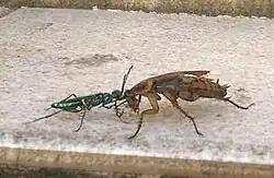 Eine Juwelwespe, die eine gelähmte Schabe zu ihrer Höhle führt.
