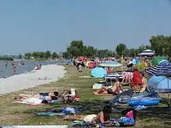 Bade- und Hafenanlagen haben im Bezirk Neusiedl am See die Orte Illmitz, Podersdorf, Weiden, Neusiedl am See, Jois und im Bezirk Eisenstadt-Umgebung Breitenbrunn am Neusiedler See, Purbach am Neusiedler See, Oggau, Mörbisch und die Freistadt Rust in Österreich sowie Fertőrákos in Ungarn.