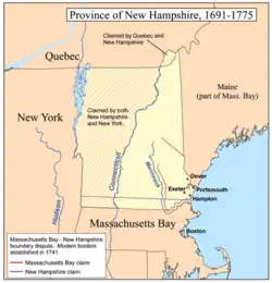 Obgleich New Hampshire bis 1741 keinen eigenen Kolonialgouverneur hatte, diente 1631 Captain Thomas Wiggin als erster Gouverneur der Provinz der Upper Plantations von New Hampshire, das heutige Dover, Durham und Stratham umfassend, die letztlich die königliche Provinz New Hampshire wurde. Die Provinz ging 1776 in den heutigen US-Bundesstaat New Hampshire über.