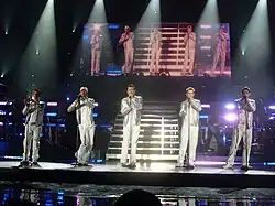 Aufgrund des Publikumszuspruchs entwickelte sich aus diesem Auftritt die Überlegung eines gemeinsamen musikalischen Projektes.[9] Im Rahmen der American Music Awards 2010 präsentierten sich beide Gruppen als NKOTBSB erstmals mit einer choreografierten Show, in der ein Teil ihrer jeweiligen Hits miteinander verwoben worden war. Anlässlich der traditionellen Silvesterfeier folgte ein zweiter Auftritt vor etwa einer Million Menschen am New Yorker Times Square. Mit Don’t Turn Out the Lights veröffentlichten NKOTBSB im Dezember 2010 ihre erste gemeinsame Single, die Platz 14 in den Billboard Hot 100 erzielte.[10] Im Mai 2011 folgte die Veröffentlichung einer Kompilation, die jeweils fünf Hits der beiden Bands sowie zwei neue Titel und ein Mashup enthielt. Das Album stieg auf Platz sieben der Billboard 200 ein, in Kanada erreichte es Position sechs.[11] Unter dem Titel One night – One stage – Once in a lifetime waren die beiden Gruppen von Juni 2011 bis Mai 2012 gemeinsam auf Welttournee; dabei gastierten sie unter anderem im historischen Fenway Park in Boston.[12] Am 29. April 2012 wurde eines ihrer Konzerte aus der O2Arena in London live in 400 Kinos in Europa sowie weltweit per Stream übertragen.