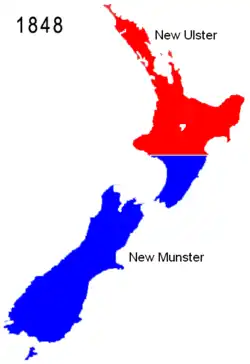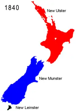 Als am 16. November 1840 Neuseeland per Letters Patent zu einer eigenständigen Kolonie erklärt wurde und damit nicht mehr länger der Kolonie New South Wales unterstellt war, wurden die drei Hauptinseln Neuseelands, die bis dato als Northern Island, Middle Island und Stewart's Island bekannt waren, unter geographischen Gesichtspunkten als New Ulster (Nordinsel), New Munster (Südinsel) und New Leinster (Stewart Island) bezeichnet.[1]