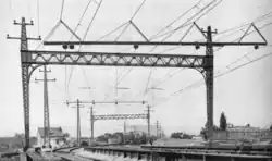 Für die Stromzufuhr wurde das 25-Hz-Wechselstromsystem mit 11 kV der New Haven verwendet. Die Oberleitung war an Portalgittermasten aufgehängt und besaß zwei übereinander angeordnete Tragseile (Compound Catenary). Die oberen Tragseile waren an den Oberkanten der Traversen aufgehängt und blieben stromlos. Daran waren in der Mitte der 300 Fuß (91,44 m) langen Felder die unteren Tragseile mittels Isolatoren aufgehängt sowie mit quer verlaufenden Stangen untereinander verbunden. Insbesondere waren die unteren Tragseile nicht an den Masten befestigt. Damit die Oberleitung in Kurven dem Verlauf der Gleise folgen konnte, wurden die Tragseile an diesen Stellen zusätzlich seitlich verspannt. Ferner wurden innerhalb der Weichenwinkel zusätzliche Querdrähte zur Führung der Stromabnehmer angebracht.