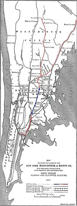 Die New York, Westchester and Boston Railway Company wurde am 20. März 1872 gegründet, um zwischen den bestehenden Strecken eine weitere Eisenbahn von der damaligen New Yorker Stadtgrenze am Harlem River durch den Westchester County zu bauen. Die Strecke sollte vom Harlem River aus durch die östliche Bronx, dann nach Mount Vernon und weiter durch den südöstlichen Teil des County bis nach Port Chester verlaufen. Die Konzession enthielt außerdem zwei Zweigstrecken, eine von der 177th Street, Bronx, Richtung Osten nach Throgs Neck, und eine weitere von Mount Vernon in nördliche Richtung über White Plains nach Elmsford. Die Gleise sollten in Teilen parallel und damit in Konkurrenz zu den beiden Strecken der New Haven verlaufen. Der Gründerkrach von 1873 setzte dem Unternehmen jedoch noch vor Baubeginn ein Ende.[3]