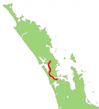| Straßenende: | nahe SH 1 bei Auckland (36° 50′ 53″ S, 174° 47′ 0″ O) |