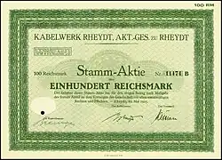 - ↑ a b c Aktie der Kabelwerke Rheydt aus dem Jahr 1941 mit kurzen Informationen zur Geschichte, abgerufen am 9. Juli 2019.