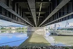Die Nibelungenbrücke in Linz verbindet die Stadtteile Innenstadt und Urfahr. Sie verläuft in nord-südlicher Richtung über die Wasserstraße Donau und ist 250 Meter lang, 30 Meter breit und liegt auf zwei Betonpfeilern. Die Brückendurchfahrtsbreite zwischen den Pfeilern beträgt 90,1 Meter, die Durchfahrtshöhe 7,52 m bei Normpegel.[1] Die Brücke wurde 1938 bis 1940 errichtet direkt neben der Stelle, an der bereits um 1500 die erste und lange Zeit einzige Linzer Brücke errichtet wurde. Die alte wurde nach Fertigstellung der neuen abgerissen.