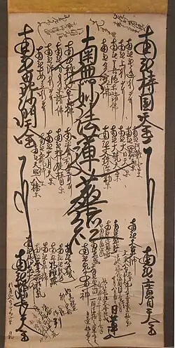 Nichiren predigte seine Lehre weiter und scharte eine große Zahl Anhänger um sich, was den Unmut der Regierung und religiöser Autoritäten hervorrief. Eine Folge davon war die teilweise gewalttätige Verfolgung seiner Anhänger zu seinen Lebzeiten und auch danach wie zum Beispiel in Matsubagayatsu, Komatsubara und Tatsunokuchi. Er selbst wurde auf die Halbinsel Izu und später für drei Jahre (1271–74) auf die Insel Sado[12] verbannt. Am Ort seiner Verbannung, in der Nähe des heutigen Dorfes Niibo, wurde im 17. Jahrhundert der Tempel Konpon-ji erbaut, unweit dessen, den Ort markierend, den Nichiren zur Meditation aufzusuchen pflegte, der Tempel Jisso-ji. Nichiren verfasste jedoch weitere Schriften, auch solche, die an die Regierung gerichtet waren. Seine Anhänger ermutigte er mit Briefen, die bis zum heutigen Tag in großer Anzahl erhalten geblieben sind und als Gosho oder Goibun bezeichnet werden. Mit zu den wichtigsten Schriften gehören die „Kaimoku Sho“ (Das Öffnen der Augen)[13] und die „Kanjin no Honzon Sho“ (Das Objekt der Hingabe).[14][15] Die letztere Schrift dient als theoretische Grundlage für Nichirens kalligraphisches Mandala, den Gohonzon. Ab dem Jahr 1272 begann er damit, diese Mandalas für einige seiner Anhänger anzufertigen. Ein Beispiel hierfür ist der in der Nichren Shu verwendete sog. Shutei Gohonzon,[16] der auf einer Vorlage Nichirens basiert.