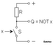 Ein Nicht-Gatter kann beispielsweise auf einem bipolaren Schalttransistor in Emitterschaltung (siehe Bild links) basieren, der den Ausgang auf Masse (logisch 0) legt, sobald er eingeschaltet ist. Ist er aus, so ist die Masseverbindung unterbrochen und der Ausgang liegt durch den Kollektorwiderstand der Emitterschaltung auf Pluspotenzial (logisch 1).