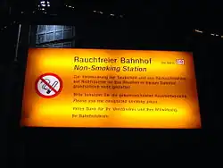 Nach Inkrafttreten des Nichtraucherschutzgesetzes, das das Rauchen lediglich in Bahnhofsgebäuden untersagte, hat die Deutsche Bahn das Rauchverbot auf den gesamten Bahnhofsbereich, also auch Bahnsteige, Unterführungen und Bahnhofsvorplätze, ausgedehnt. Ausgenommen davon sind nur gekennzeichnete Raucherbereiche. Diese Regelung ist in der Hausordnung der Deutschen Bahn auf annähernd jedem Bahnsteig in den Bahnhöfen nachzulesen. Das Rauchverbot gilt hier inzwischen auch für elektrische Zigaretten. Ebenso ist das Wegwerfen von Zigarettenkippen – auch auf die Gleise – verboten. Bei absichtlicher Verschmutzung wird ein Bußgeld von mindestens 60,- € verhängt. Weitere Verstöße führen zu Hausverweis oder Hausverbot.[10]