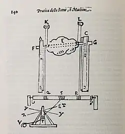 Das Ende des zweiten Werks handelt größtenteils davon wie der Himmel mit Wolken geschmückt werden kann. Sabbatini teilt den Himmel in verschiedene Teile ein und beschäftigt sich mit den unterschiedlichsten Möglichkeiten, „wie man nach und nach einen Teil des Himmels sich bewölken lassen kann“.[12] Sabbatini stellt verschiedene Formen von Maschinen vor, zum einen mit verschiedenen Zahnrädern, die dafür zuständig sind, dass die Wolken von dem hinteren Teil der Bühne nach vorne kommen. Sabbatini beschreibt zum anderen auch eine Form der Wolke, auf der Personen stehen und befördert werden konnten. Sabbatini beschreibt wieder, dass die zuständigen Personen für Wolken und Wind gleichzeitig arbeiten müssen, aufpassen sollen, dass die Wolke kein Übergewicht bekommt. Die Wolkenmaschinen waren sehr beliebt im Theater und symbolisierten das Unerreichbare beziehungsweise Unglaubliche, wie zum Beispiel Gott.[13]