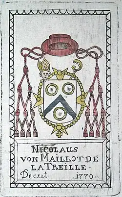 Zum Jahreswechsel 1777/1778 wurden Kurpfalz und Bayern zum Staat Kurpfalz-Bayern vereinigt und der Hof siedelte nun von Mannheim nach München über. Nicolas Maillot de la Treille folgte Kurfürst Karl Theodor 1781 dorthin und wurde hier Vorstand sämtlicher kurfürstlicher Bibliotheken sowie Malteserkomtur der Bayerischen Zunge des Ordens, zu Möschenfeld. 1784 berief man den Priester zum Ehrenmitglied der Bayerischen Akademie der Wissenschaften.[5] Papst Pius VI. ernannte Maillot de la Treille zum infulierten Päpstlichen Hausprälaten. Durch die Infulierung war er ehrenhalber berechtigt, bei festlichen Anlässen eine bischöfliche Mitra zu tragen. Diese nahm der Prälat auch in sein persönliches Wappen auf.