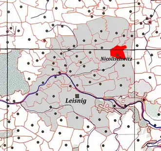 Nicollschwitz ist ein Ortsteil der Stadt Leisnig im Landkreis Mittelsachsen. 1946 hatte der Ort 115 Einwohner.[2] Am 1. Juli 1950 wurde er nach Bockelwitz eingemeindet, 2012 ging er mit diesem nach Leisnig.