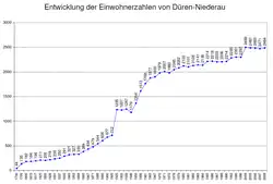 In den ersten Jahrhunderten war Niederau eine kleine Siedlung mit einzelnen Bauernhöfen. Für das Jahr 1730 nennt eine Liste der „Unterthanen“ des Schlosses Burgau für den Ort 44 Einwohner. 1799 sind in der Bevölkerungsliste des französischen Maire 135 Personen in Niederau aufgezählt.[28] Im Laufe des 19. Jahrhunderts stieg die Einwohnerzahl deutlich an und erreichte im Jahr 1900 bereits mehr als das Dreifache des Wertes von 1800, wozu die zunehmende Industrialisierung wesentlich beitrug. Der Anstieg um fast 75 % zu Beginn des 20. Jahrhunderts lässt sich mit der erhöhten Mobilität der Pendler durch die neu eingerichtete Bahn erklären. Die Eingemeindung in die Stadt Düren im Jahr 1972 stoppte den Anstieg nur kurz. Von den rund 2500 Menschen, die heute in Niederau leben, sind angesichts der beiden Seniorenheime im Ort viele im Rentenalter.[29]