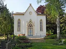 Im Jahr 1852 wurde der Friedhof nach Süden hin erweitert, indem man angrenzende Gartengrundstücke aufkaufte.[14] Das neue Areal erhielt eine Friedhofsmauer; die Weihe des neuen Bodens erfolgte am 20. November 1853. Die alte Friedhofskirche war bereits 1850[15] wegen Baufälligkeit geschlossen worden. Im Jahr 1856 wurde sie abgerissen. Der Neubau erfolgte auf dem neuen Friedhofsteil, rund 100 Meter südlich des bisherigen Kapellenstandorts. Die Grundsteinlegung fand am 26. März 1957 statt. Teile wie das spätgotische Maßwerk der Fenster, aber auch Teile der Inneneinrichtung, wurden von der alten Kapelle übernommen. Die Kirchweihe wurde am 23. November 1857 festliche begangen. Im Jahr 1864 erhielt der Friedhof abermals gen Süden eine Erweiterung mit Weihe im Jahr 1865. Im Jahr 1859 und 1868 wurde die Friedhofsmauer erneuert; der Verschönerungsverein der Stadt stiftete 1866 Bänke „mit kleinen Blumenanlagen in der Nähe“ auf dem Nieder- und Oberfriedhof.[16]