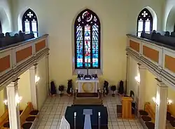 Das Kapelleninnere besteht aus einem kleinen Vorraum, von dem rechts ein kleinerer Raum abgeht (vermutlich Leichenhalle, in der Gegenwart Lagerraum); über eine Holztreppe auf der linken Seite gelangt man auf die Empore. Das Kirchenschiff hatte zur Weihe 19 Sitzreihen, in der Gegenwart fassen das Kapellenschiff und die Emporen je 80 Personen.[41] Der Altartisch und die Kanzel wurden im Neubau an der dem Eingang gegenüberliegenden Südseite aufgestellt. Die Kanzel stammte aus dem Vorgängerbau und erhielt eine neue Bekrönung und eine Säule; der Zugang zur Kanzel erfolgte über eine neue Zugangstür. Hinter der Kanzel befand sich ursprünglich ebenfalls eine Empore.