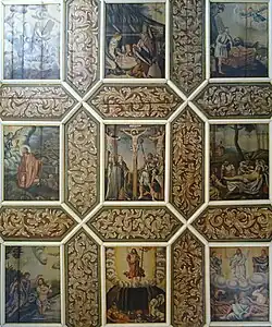 Bis 1685 erfolgte der Bau der Holzdecke durch Hans Dittmann. Sie war mithilfe von Profilleisten in Hauptfelder unterteilt, an die sich weitere schmalere Felder anschlossen. Die Deckenbemalung, wahrscheinlich in Tempera auf Holz,[30] schuf Christian Weisse, wobei in den Hauptfeldern biblische Szenen und in den schmaleren Feldern Blumenwerk entstanden.