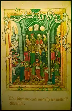 Der Name „Niedergericht“ taucht erstmals als neddersteten Gherichtes im Hamburger Stadtrecht von 1497 auf.[1] Der Rat bildete als Ganzes das Appellationsgericht und damit das Obergericht.[2] Das als Niedergericht bezeichnete Gericht war vermutlich viel älter und wurde in früheren Stadtrechtsniederschriften, so 1270, als Dingbank benannt.[3] Das Niedergericht war das Zivil- und Strafgericht erster Instanz und in Hamburg nicht auf die Niedere Gerichtsbarkeit festgelegt.[1] Es hatte seinen Sitz ursprünglich in einer halboffenen Halle am Nikolaifleet in der Nähe der Trostbrücke.[4]