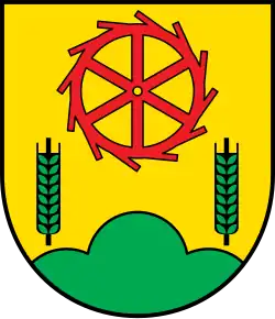 Blasonierung: „In Gold über grünem Dreiberg ein sechsspeichiges rotes Mühlrad mit zwölf Schaufeln, beiderseits begleitet von je einer zweizeiligen grünen Ähre.“ |