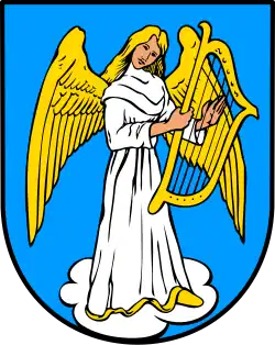 Blasonierung: „In Blau auf silbernem Gewölk stehend ein Engel mit goldgesäumtem silbernem Gewand, mit goldenen Flügeln, eine goldene Harfe spielend.“[11] |