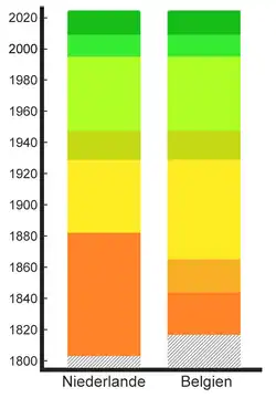 Die Ausgliederung und Konstituierung des Niederländischen aus dem Germanischen kann als dreifacher sprachgeschichtlicher Vorgang verstanden werden:[33][34]