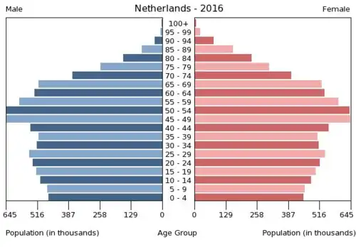 Niederlande hatte 2023 17,9 Millionen Einwohner.[18] Das jährliche Bevölkerungswachstum betrug + 1,0 %. Trotz eines Sterbeüberschusses (Geburtenziffer: 9,5 pro 1000 Einwohner[19] vs. Sterbeziffer: 9,6 pro 1000 Einwohner[20]) wuchs die Bevölkerung durch Migration. Die Anzahl der Geburten pro Frau lag 2022 statistisch bei 1,5, die der Europäischen Union betrug 1,5.[21] Die Lebenserwartung der Einwohner der Niederlande ab der Geburt lag 2022 bei 81,7 Jahren.[22] Der Median des Alters der Bevölkerung lag im Jahr 2021 bei 41,7 Jahren.[23] Im Jahr 2023 waren 15,3 Prozent der Bevölkerung unter 15 Jahre,[24] während der Anteil der über 64-Jährigen 20,7 Prozent der Bevölkerung betrug.[25]