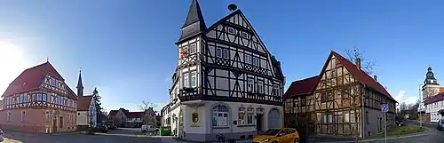 - Das Rathaus wurde 1905 im barockisierenden Fachwerkstil (Kulturdenkmal) errichtet.