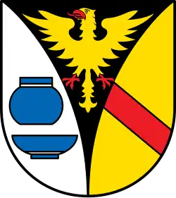 Blasonierung: „Gespalten durch eine eingebogene, gestürzte schwarze Spitze, darin ein rotbewehrter und- gezungter goldener Adler, rechts in Silber über einer blauen Schale ein schwebender blauer Krug, links in Gold ein roter Schrägrechtsbalken.“[8] |