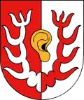 Blasonierung: „Gespalten von Rot und Silber; belegt mit einem Hirschgeweih mit Grind in verwechselten Tinkturen, dazwischen ein schwebendes goldenes Ohr auf dem Spalt.“
