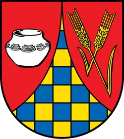 Blasonierung: „In Rot eine eingeschweifte, von Blau und Gold geschachte Spitze; rechts eine silberne Urne, links zwei schräggekreuzte goldene Ähren.“