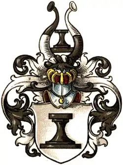 Das Wappen zeigt in Silber einen schwarzen Amboss. Auf dem Helm mit schwarz-silbernen Decken und Wulst der Amboss zwischen zwei schwarz-silbern übereck geteilten Hörnern.[20]