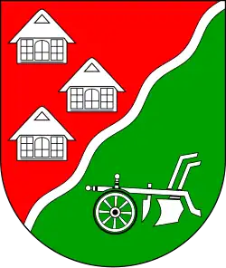 Blasonierung: „Von Rot und Grün durch einen gesenkten, schräglinken silbernen Wellenbalken geteilt, oben drei silberne Reethäuser, unten ein silberner Pflug.“[4]