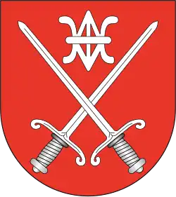 Blasonierung: „In Rot zwei aufrecht gekreuzte silberne Schwerter. Im Winkel zwischen den Klingen ein silbernes, die durchbrochene Figur einer heraldischen Lilie aufweisendes Monogramm.“[6]