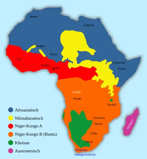 | Sango | Sangho | 3 Mio. | Volta-Kongo, Ubangi | Zentralafrik. Rep. (Ngabandi-basierte Kreolsprache) |