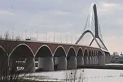 - Die Straßenbrücke De Oversteek verbindet die Bezirke Nijmegen-Nieuw-West und Nijmegen-Noord miteinander. Im Jahr 2013 wurde der Bau der Netzwerkbogenbrücke abgeschlossen. Sie soll die östliche Straßenbrücke, die Waalbrug, entlasten. Die Brücke verfügt über die längste Spannweite in Europa, die aus einem Bogen besteht. Der Name der Brücke erinnert an die Überquerung der Waal am 20. September 1944, als amerikanische Fallschirmspringer mit Booten aus Canvas den Fluss während der Operation Market Garden überquerten.[3]