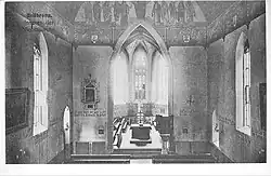 Im Innern wurde die seitliche Empore entfernt. Das Tonnengewölbe mit seinen Durchzugsbalken bekam einen kräftigen rotbraunen Anstrich, die Wände wurden mit einem matten Weiß angemalt. Zwischen dem Tonnengewölbe und den Wänden wurde hoch oben ein breiter Fries mit reichen Ornamenten angebracht.[34] Ein Freskogemälde wurde über dem Chorbogen geschaffen: „Christus und vor ihm die klugen und törichten Frauen“.[32][35] Die gesamte Kirche wurde mit auf die Wand gemalten Bibelsprüchen und Liedzeilen geschmückt: