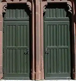 Hannes Mayer entwarf 1949 Kanzel, Türen, Fenster, Gewände und die Inneneinrichtung. Die Türblätter des Westportals sind ein Beispiel für die Traditionsgebundenheit im Sakralbau Württembergs um 1950. Die Formgebung orientiert sich dabei an der spätgotischen Flachschnitzerei des 15. Jahrhunderts. Nach der Meinung des Kunsthistorikers Julius Fekete sei die Holzarbeit „das Resultat der kunsthistorisch fundierten Auseinandersetzung mit der überlieferten gotischen Bausubstanz – hier dem steinernen Türgewände – der Nikolaikirche“[41] und könne „als mustergültig bezeichnet werden für die traditionsorientierte für die Zeit um 1950 typisch zu bezeichnende frühe Form des Wiederaufbaus evangelischer Kirchen in Württemberg“.[41] Die Türblätter der Nikolaikirche bezeichnete er als „unverzichtbare, weil signifikante Bestandteile (Zubehör) des Kulturdenkmals“.[41]