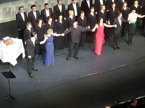 Nikolaus Harnoncourt (1. Reihe, 3. von links), beim Schlussapplaus des Da-Ponte-Zyklus im Theater an der Wien (Così fan tutte, 29. März 2014)