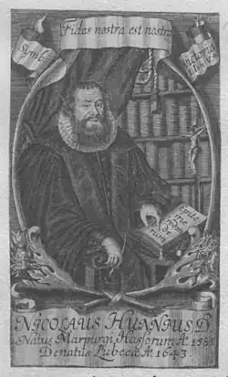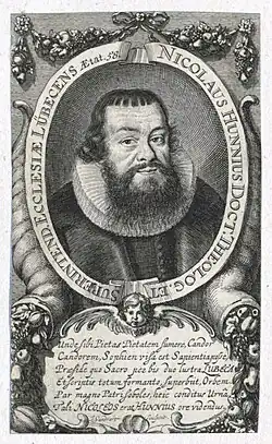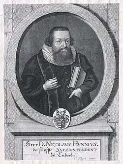 - ↑ Siehe dazu Ludwig Heller: Nikolaus Hunnius. Sein Leben und Wirken; ein Beitrag zur Kirchengeschichte des siebzehnten Jahrhunderts, größtentheils nach handschriftlichen Quellen. Lübeck: Rohden 1843 Digitalisat, S. 23