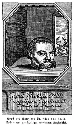 Nach dem plötzlichen Tod Christians I. am 25. September 1591 begann auf Betreiben der lutherischen Orthodoxie und des Adels durch dessen Witwe Sophie von Sachsen, einer orthodoxen Lutheranerin, eine Verfolgungswelle gegen den „Kryptocalvinismus“. Alle sächsischen Kirchen- und Staatsbeamten mussten die anticalvinischen Visitationsartikel unterschreiben, ansonsten wurden sie abgesetzt.[3] Krell wurde am 23. Oktober 1591 verhaftet und auf der Festung Königstein in der später nach ihm benannten Krellburg eingekerkert. Die Anklage gegen ihn wurde 1595 zu einem Inquisitionsprozess umgewandelt. Kaiser Rudolf II. beauftragte 1599 die Böhmische Appellationskammer in Prag mit dem Fall, und am 8. September 1601 wurde er wegen Landfriedensbruch zum Tod verurteilt. In Dresden fand am 9. Oktober seine öffentliche Hinrichtung durch das Schwert statt.[4] Er wurde auf dem Dresdner Frauenkirchhof in der Gruft des Oberfeldzeugmeisters Caspar Vogt von Wierandt beigesetzt.