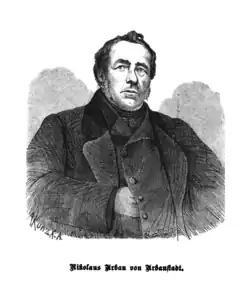 - ↑ Nikolaus von Urbanstadt: Geschichte der Bezirkshauptmannschafts-Gebiete Komotau, Saaz und Kaaden. Mit besonderer Berücksichtigung der wichtigsten landwirthschaftlichen, industriellen und commerziellen Zweige. Band 5, Komotau 1873, Porträt