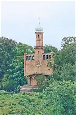Der Überlieferung zufolge wünschte sich des Königs Tochter Charlotte (seit 1825: Zarin Alexandra Feodorowna) anlässlich eines Besuchs 1819 Glockenklang oberhalb der Pfaueninsel. Da die Bewohner der Insel weder Kirche noch Schule in ihrer Nähe besaßen, ließ der König per Kabinettsorder vom 22. Mai 1832 den Bedarf an solchen Bauten für die Insel und Klein-Glienicke ermitteln, damit die Bauten auf Staatskosten erfolgen konnten.