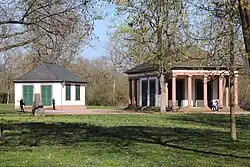 Zu seinen Bauwerken gehört der Nilkheimer Pavillon (Spiegelsaal), der um 1830–35 als Amphiprostylos mit ionischen Säulen errichtet wurde. Der Spiegelsaal wird nur zu festlichen Anlässen wie Trauungen für Gäste geöffnet. Daneben liegt der ehemalige Speisesaal (Billardsaal), ein rechteckiger Bau mit Walmdach. Auf einem Wegekreuz steht ein offener Rundtempel, ein Monopteros mit sechs Säulen. Zur weiteren Ausstattung gehören eine Hermenstatue, die zwei steinernen Pfosten einer Schaukel, ein Pumpbrunnen, historische Steinbänke, eine Sphinx (Muschelkalk, 1958) sowie ein Obelisk. Dieser Obelisk, errichtet 1819, musste zum Bau der benachbarten Eisenbahnbrücke 1910 in den verkleinerten Park versetzt werden. Die Kugel an seinem oberen Ende trägt den Scherenschnitt eines Saturn mit Sense. Schließlich gibt es noch die beiden steinernen Löwen des ehemaligen Siegfrieddenkmals, eines Kriegerdenkmals, das gegenüber dem Herstallturm im offenen Schöntal stand und das Römerbad aus dem Kastell Stockstadt, das 1968 in den Nilkheimer Park verbracht wurde.[1]