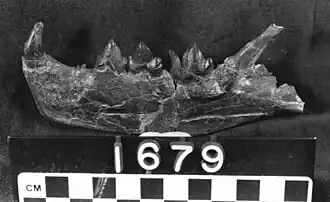 Unterkiefer von Nimravus brachyops im Museum of Paleontology der University of California. | ||||||||||||