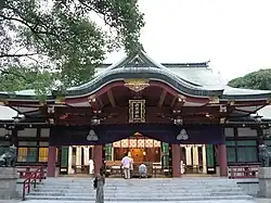 Aus der Muromachi-Zeit stammt das große Vordertor (表大門 Omote daimon; Wichtiges Kulturgut = ◎; 7). Toyotomi Hideyori ließ es 1604 wiederherstellen. Die Glocke, deren Inschrift auf das Jahr 1610 hinweist, wurde von dem Daimyō und Feldherrn Katagiri Katsumoto (1556–1615) gestiftet. Ein Baudenkmal ist auch die lange Mauer (大練塀; Ōneribei; hellbraun markiert; ◎) aus der frühen Muromachi-Zeit, die den Schrein im Südosten umschließt. Sie gehört zu den „Drei großen Mauern“ in Japan.[A 3]